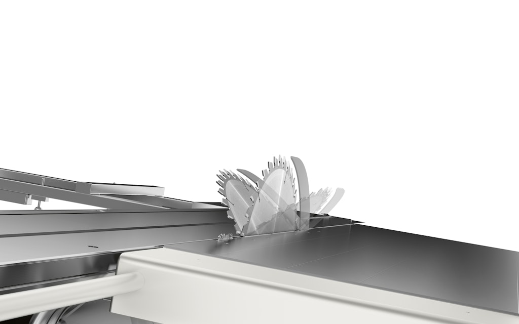 Een cirkelzaag met zaagunit welke schuinstelbaar is van +46° tot -46°. Eindelijk voor iedereen beschikbaar. Standaard geleverd met aangedreven en geprogrammeerde zaagbladbeweging. Maakt het mogelijk om gelijktijdig met een 400 mm zaagblad en 160 mm voorritszaag zowel 90° als ± 46° gekanteld te zagen, waarmee de maximale snijhoogte op gefineerde panelen en massief hout wordt gegarandeerd.